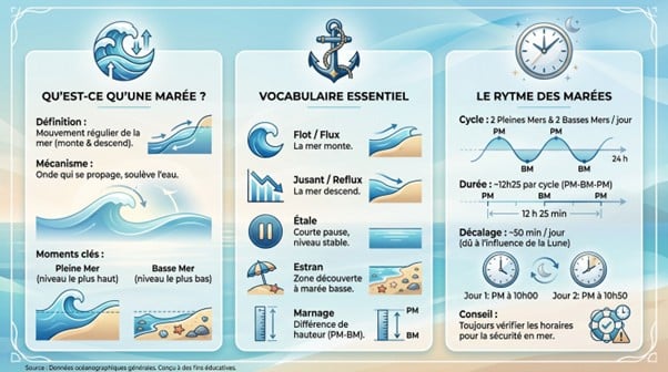 Le jargon marin fait peur, mais pour comprendre les marées et leurs secrets, quelques mots suffisent. C’est moins sorcier qu’il n’y paraît.