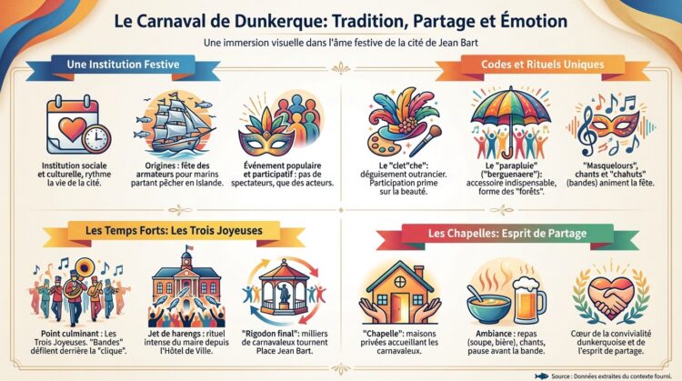 Ce système de chapelles incarne le cœur battant de la convivialité dunkerquoise et montre l’esprit de partage unique de cet événement emblématique de Dunkerque côte d’opale. Pour les détails pratiques, consultez le site de l’office du tourisme.