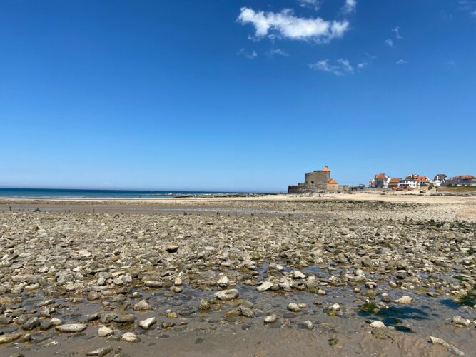 La plage d’Ambleteuse surprend par sa particularité géographique : découpée par la rivière Slack, elle alterne galets et sable selon les marées. Depuis la digue-promenade, l’imposant Fort Vauban du XVIIe siècle domine le paysage, vestige militaire historique.